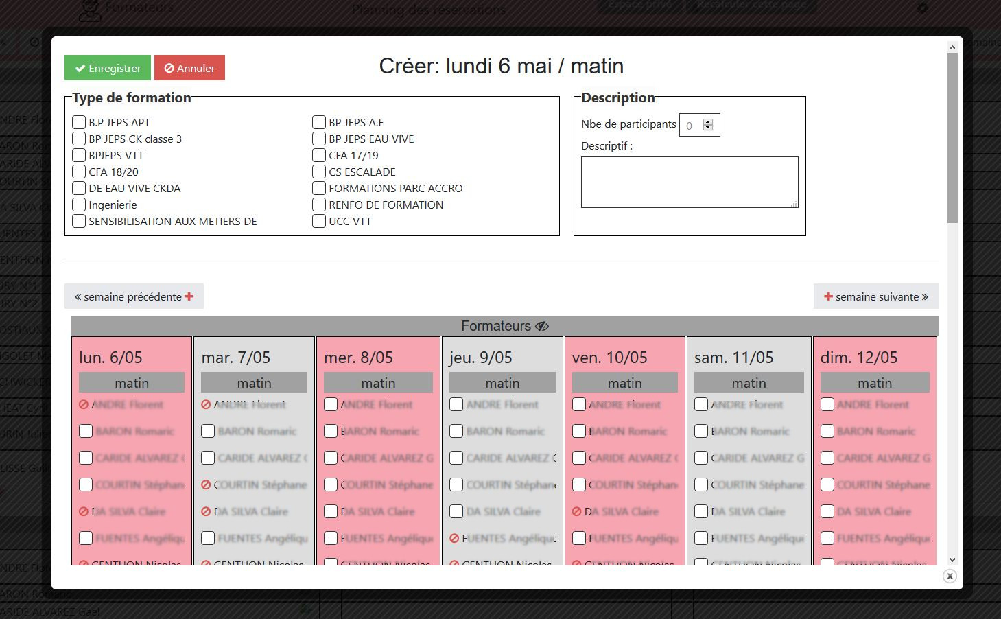 • ce système de gestion des réservation en ligne intègre l’ensemble du matériel et des lieux de stage mais également le pool de formateurs : toute réservation de matériel permet de réserver plusieurs ressources (par exemple un véhicule + une remorque + un ensemble de bateau) mais aussi d’associer un ou plusieurs formateurs responsables. Ceux-ci sont avertis par mail en cas de modification de la réservation.